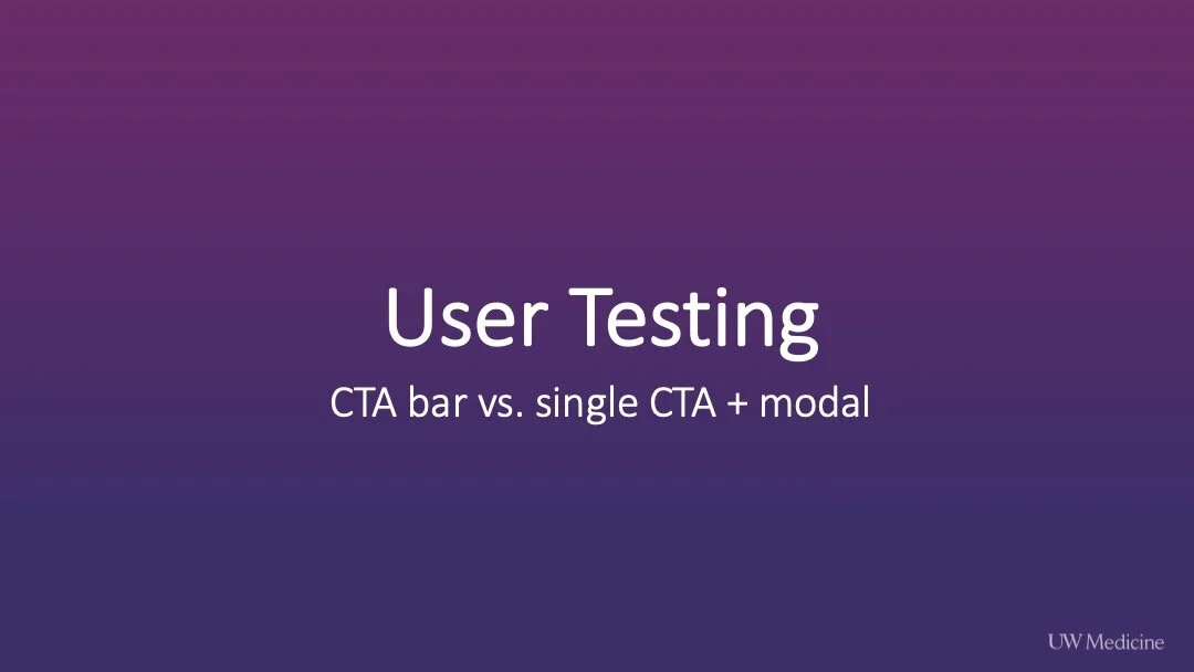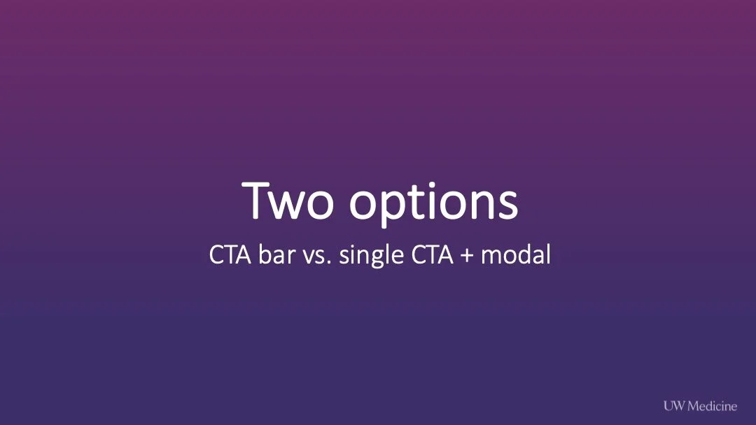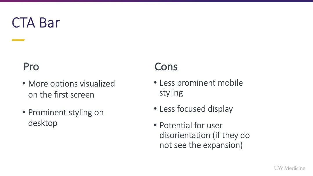 After discussing the preliminary concepts with our Product Owner, we decided to move forward and test the multi-button CTA bar and single CTA with modal concepts with users.