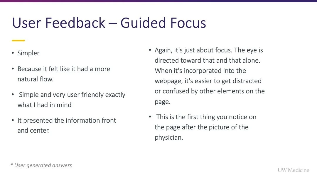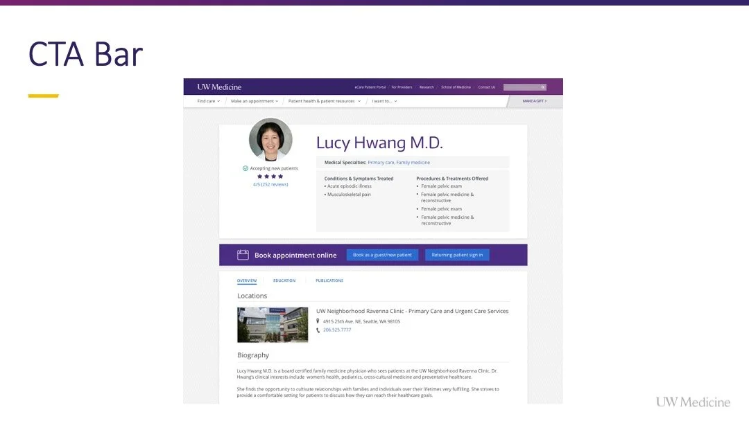 Note: The exploratory work for the provider bio redesign and taxonomy creation was happening in tandem with this appointing initiative. Learn how I advocated for, secured buy-in for the bio template redesign to create space for and prioritize smarter presentation of taxonomy terms to aid patient decision-making on this sibling project write-up.