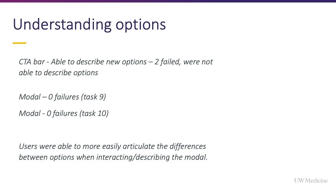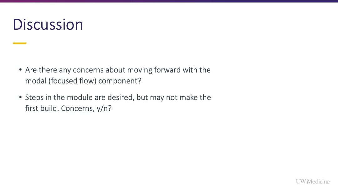 Following the results of the user test, I moved into scenario mapping. I partnered with our Data Manager and Product Owner to understand how the constraints of the data and the system that we would be integrating with (Epic) would impact the sequence and steps in the flow. Our Engineer provided valuable feedback on the possibility of flow steps as we investigated how to build conditional logic within the modal to capture all possible scenario states.